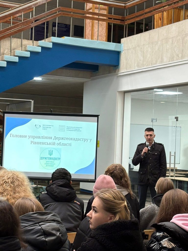 В.о. начальника Головного управління Держгеокадастру у Рівненській області Микола Шустов на запрошення ректора Національного університету водного господарства та природокористування Віктора Мошинського взяв участь у заході Навчально-наукового інституту агроекології та землеустрою «День Кар’єри – 2025». Під час заходу Микола Шустов презентував студентам НУВГП Головне управління, з можливістю проходження практики, стажування тощо.